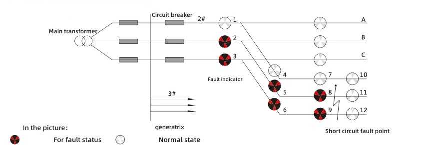 ອີງຕາມຄຸນລັກສະນະຂອງປະກົດການວົງຈອນສັ້ນ, ການປ່ຽນແປງຢ່າງກະທັນຫັນຂອງປະຈຸບັນໃນໄລຍະວົງຈອນສັ້ນທີ່ປະກອບດ້ວຍຄວາມລົ້ມເຫຼວຂອງພະລັງງານຂອງອຸປະກອນປ້ອງກັນຖືກນໍາໃຊ້ເປັນເງື່ອນໄຂການປະຕິບັດ. ວິທີການຕີລາຄາສໍາລັບແຜນວາດຊີ້ບອກຄວາມຜິດມີດັ່ງນີ້: ເມື່ອໄຟຊີ້ບອກ 2, 5, ແລະ 8 ຂອງໄລຍະ A ຂອງສາຍ 2, ບໍ່ມີໄຟຊີ້ບອກໄລຍະ B, ໄຟຕົວຊີ້ວັດ 3, 6, ແລະ 9 ຂອງໄລຍະ C ທັງໝົດປ່ຽນເປັນສີແດງ, ໃນຂະນະທີ່ໄຟຊີ້ບອກ 11 ແລະ 12 ຍັງຄົງເປັນສີຂາວ, ສາມາດກຳນົດໄດ້ວ່າມີຄວາມຜິດທາງລັດວົງຈອນ.